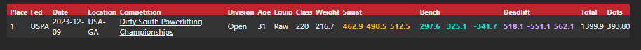 His meet results were as follows, with PRs on all 3 lifts